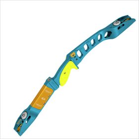 Recurve & Bare Bow riser 25” length, RH and LH versions Machined from Aluminum 6061 T6 Sandblasted matte surface, anodized colors Limbs alignment system Special compartments for optional balancing weights Gold color anodized aluminum compartment cover Steel electro plated limbs bolts Special Yellow 3D printed plastic medium grip 3 front and 3 back stabs holes Center bushing with 1 mm offset to allow better balancing by long rod Approx. 134 0 gr total