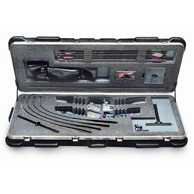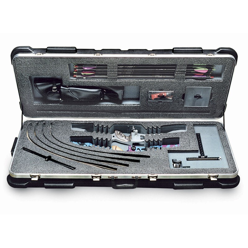 The SKB 2SKB-4214RC Double Takedown Recurve Archery Case features custom cutouts for most popular take-down recurve bow risers and two sets of limbs. Storage for most popular arrow quivers and stabilizers up to 28" long, arrow storage for up to 24 arrows, convenient accessory boxes included, HDPE shell, weather resistant o-ring seal, stackable, bumper protected hardware, solid die cast zinc locks, ATA 300 Class 1 rated. Polymer wheels.