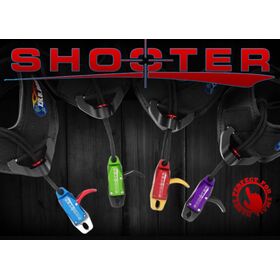 Designed specifically with the youth in mind, the new SHOOTER series features four bright color combinations of red white and blue, green and black, red and gold, and purple and black. pull trigger to open fully-independent standard caliper jaws, and let up the trigger to close. the SHOOTER has a new quick lock connection system to provide easy adjustment for any anchor point. the rope style connection between the head and strap allows for less torque and great accuracy. while also allowing the length of the release to be extremely short to fit smaller hands. tucks away easy into sleeve when not in use. available in junior or large with choice of black Velcro® strap or black leather buckle strap.