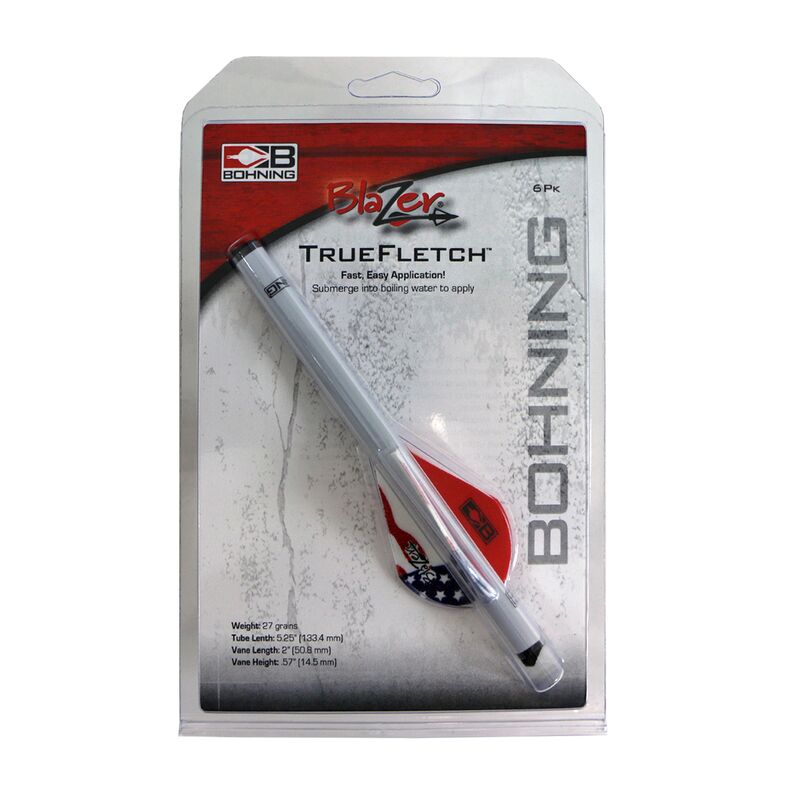 Blazer® True Fletch offers a fast and easy way to fletch arrows. It fits arrows from 0.219 -0.375” (5.6 - 9.5mm). Slowly submerge in boiling water to apply. Store in a cool place until use. Blazer® True Fletch measures 5” (12.7cm) in length and weighs an average of 27 grains.