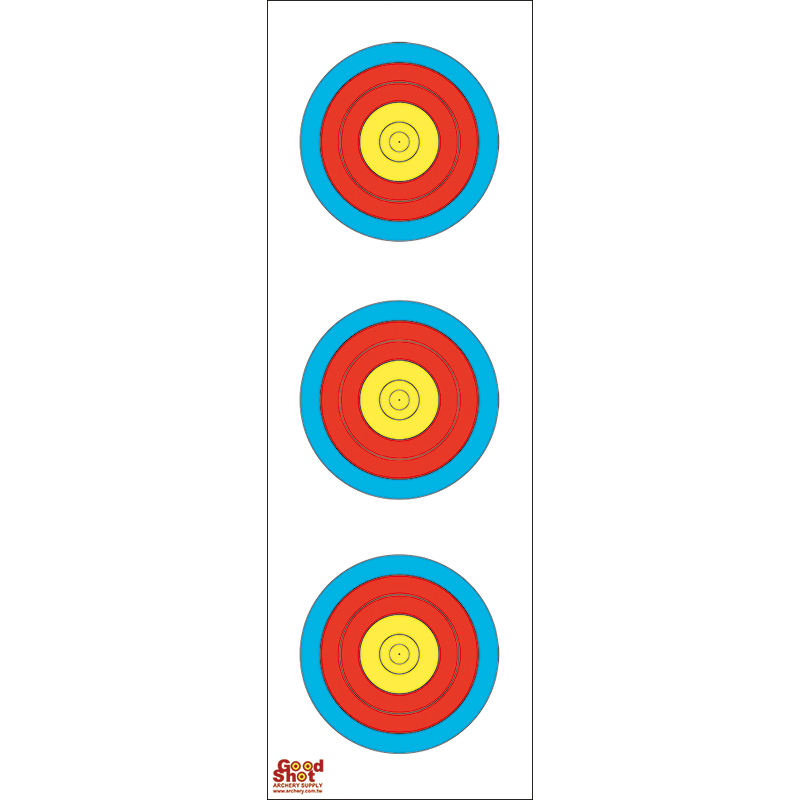 FITA 國際認證比賽用靶紙. 靶紙內含尼龍線, 比一般靶紙耐用. 40cm 靶紙內六分,直立三環靶, 室內18公尺. 單一靶面實際20公分 靶紙尺寸:65.5 x 24 公分